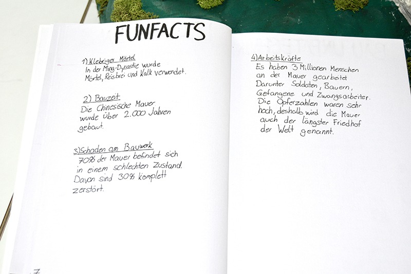 In der anschließenden Produktphase wurden – meist in kleinen Teams – eigene Fragestellungen entwickelt und kreativ umgesetzt. Dabei entstanden zahlreiche originelle und teils außergewöhnliche Produkte: von einem detailreichen Modell der Chinesischen Mauer über anschauliche Erklärungen zu Maos Personenkult bis hin zu Einblicken in die chinesische Kochkunst oder einer multimedialen Reise durch das Reich der Mitte.