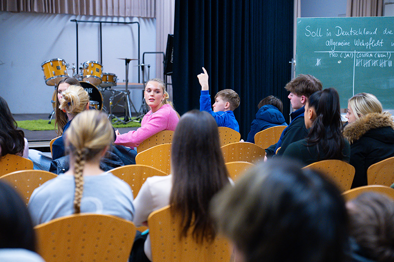 Am letzten Schultag vor den Weihnachtsferien organisierten unsere beiden Projektkurse „Debattieren“ unter der Leitung von Marina Ring und David Berghoff die Alternativveranstaltung zum Schulgottesdienst. Diesmal ging es um die Fragestellung: „Soll in Deutschland wieder eine allgemeine Wehrpflicht gelten?“ Dieses Thema ist aufgrund der aktuellen politischen Weltlage für unsere Schülerinnen und Schüler topaktuell und entstand als Fragestellung auch durch die Arbeit im Kurs.
