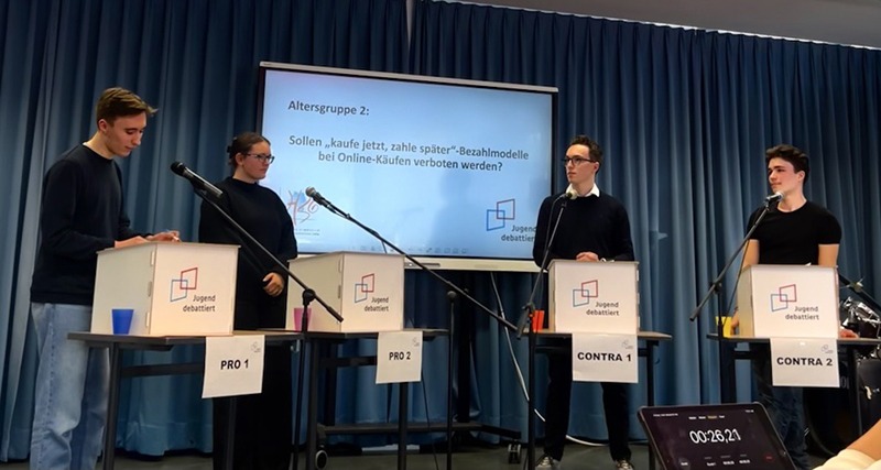 In der ersten Debatte trat Lukas Bredthauer in der Rolle Contra 1 an zusammen mit Titus vom IGS. Gemeinsam mit seinen Debattenpartnern diskutierte er über Chancen und Risiken von Online-Bezahlmethoden. Die Pro Seite argumentierte vor allem damit, dass sich besonders bei vielen kleinen Beträgen schnell Schulden anhäufen können. Außerdem wurde betont, dass solche Angebote häufig mit psychologischen Effekten arbeiten: Die schnelle Verfügbarkeit von Produkten könne Konsum stark fördern und dazu führen, dass Menschen später bereuen, einen Kauf getätigt zu haben. Hinzu komme, dass Anbieter häufig über Zinsen oder zusätzliche Gebühren Geld verdienen, besonders wenn Zahlungen verspätet erfolgen.