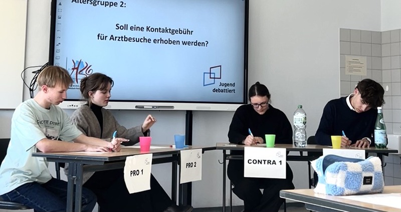 In der zweiten Debatte ging es um die Frage: „Soll eine Kontaktgebühr für Arztbesuche erhoben werden?“ Hier debattierte Ben-Luca Franke in der Rolle Contra 2 mit der Partnerin Lisa vom Korpernikus Gymnasium. Die Pro Seite argumentierte, dass eine Kontaktgebühr dazu beitragen könnte, unnötige Arztbesuche zu reduzieren und das medizinische Personal zu entlasten. Außerdem wurde darauf hingewiesen, dass es bereits Beratungsangebote gibt, die Menschen zunächst eine Einschätzung geben könnten, ob ein Arztbesuch tatsächlich notwendig ist. Als Beispiel wurde auch das schwedische Gesundheitssystem genannt, in dem ähnliche Modelle existieren.